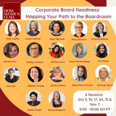 My recommendation for all women who are starting their board journey is to attend the Corporate Board Readiness Workshops offered by How Women Lead. The next 6-session virtual workshop begins October 3rd. The program, which I designed and moderate, features 20+ board directors and board experts to guide you through the board journey. You will come away with a draft board bio that has been reviewed in a small group by peers and a board-savvy leader. Over 800 women leaders have completed this program. It provides attendees with a roadmap to design their strategy to become a director.