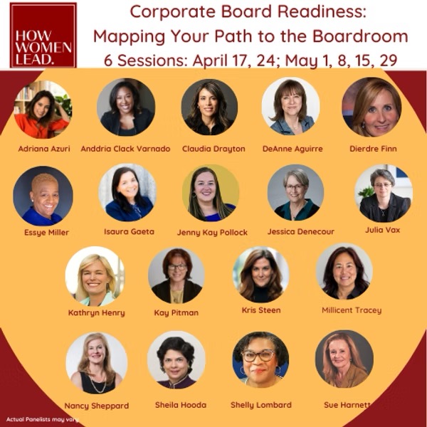 I recommend the How Women Lead Corporate Board Readiness Workshop as the starting point for any woman with the goal of joining a corporate board. The workshop, which I designed and often moderate, will be guided by numerous board directors and board experts. Throughout the journey, you’ll receive a comprehensive guidebook, learn the board eco-system, write a draft board bio that has undergone peer and board-savvy leader reviews, practice your board value proposition pitch, and have a peer review of your LinkedIn profile.